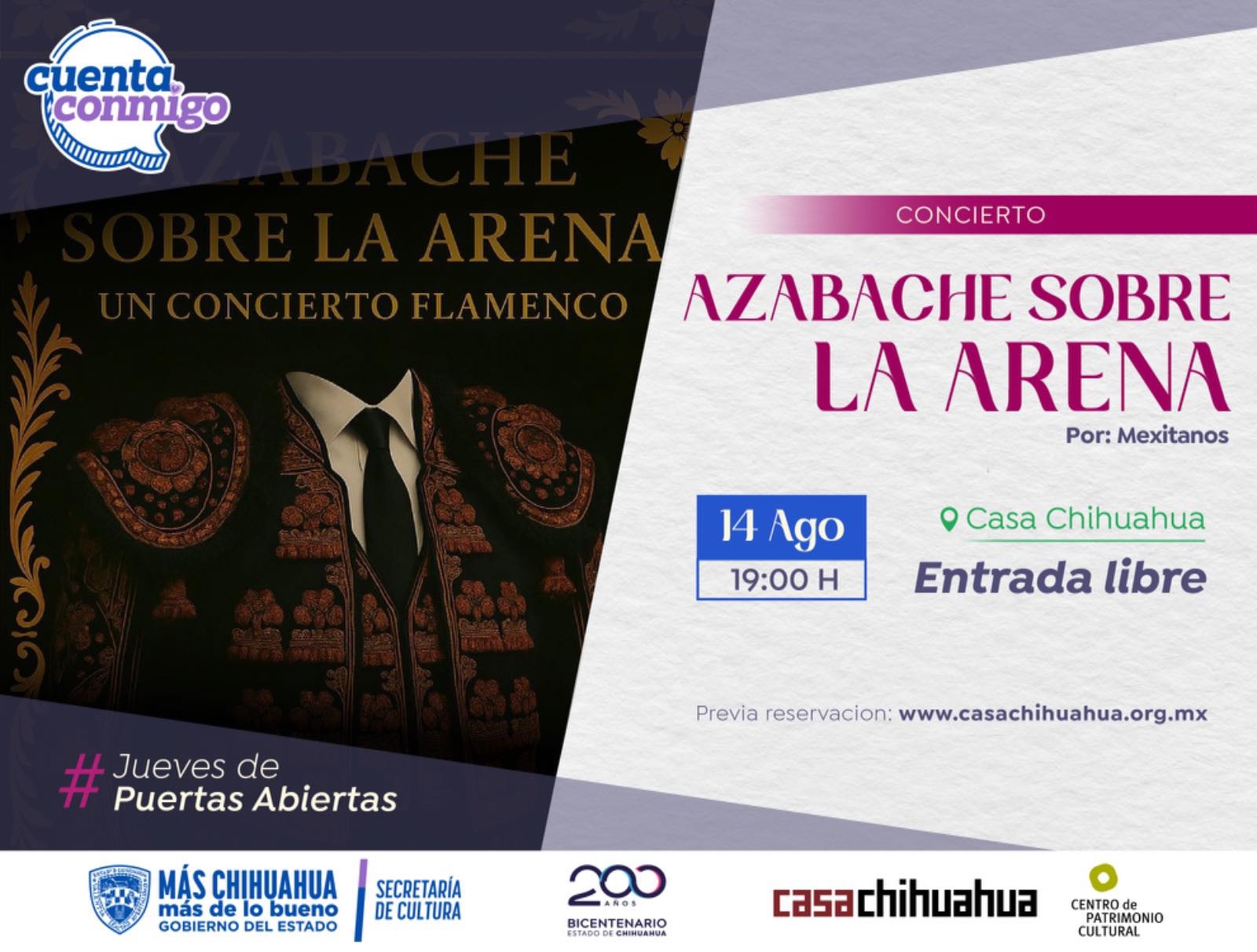 El ensamble flamenco Los Mexitanos presentará este Jueves de Puertas Abiertas el concierto “Azabache sobre la arena” en las instalaciones de Casa Chihuahua Centro de Patrimonio Cultural, por lo que se invita al público en general a disfrutar del espectáculo.